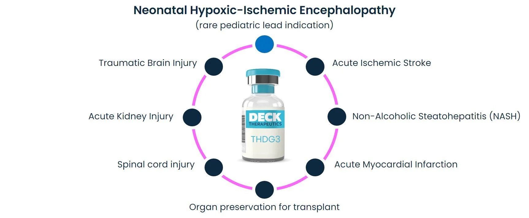 DeckTherapeutics aims to develop THDG3 in multiple indications in which the brain or other tissues are injured following hypoxia-ischemia or ischemia-reperfusion.